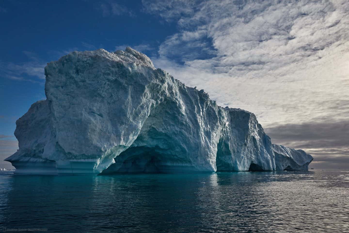 The Sermilik Fjord is incredible. It’s very wide, and has lots of icebergs. You could spend a good day just shooting on this stretch of water. Here is one iceberg that we found with a nice archway in it (below). For this photograph, I used a circular polarizer filter to remove the reflection on the water, to make it look darker, but also to enable some of the blue of the base of the iceberg to show through.
