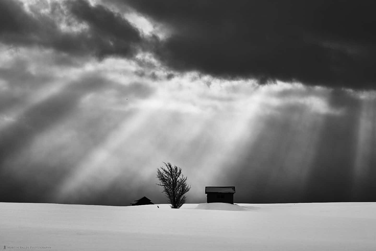 The following morning, still hoping for some heavy snow, we headed back to the road that we’d walked down the previous afternoon, and had our driver drop us by the huts and tree that you can see in this next image (below) because the sky had opened up just enough to form these beautiful crepuscular rays or god rays, as they are sometimes called.