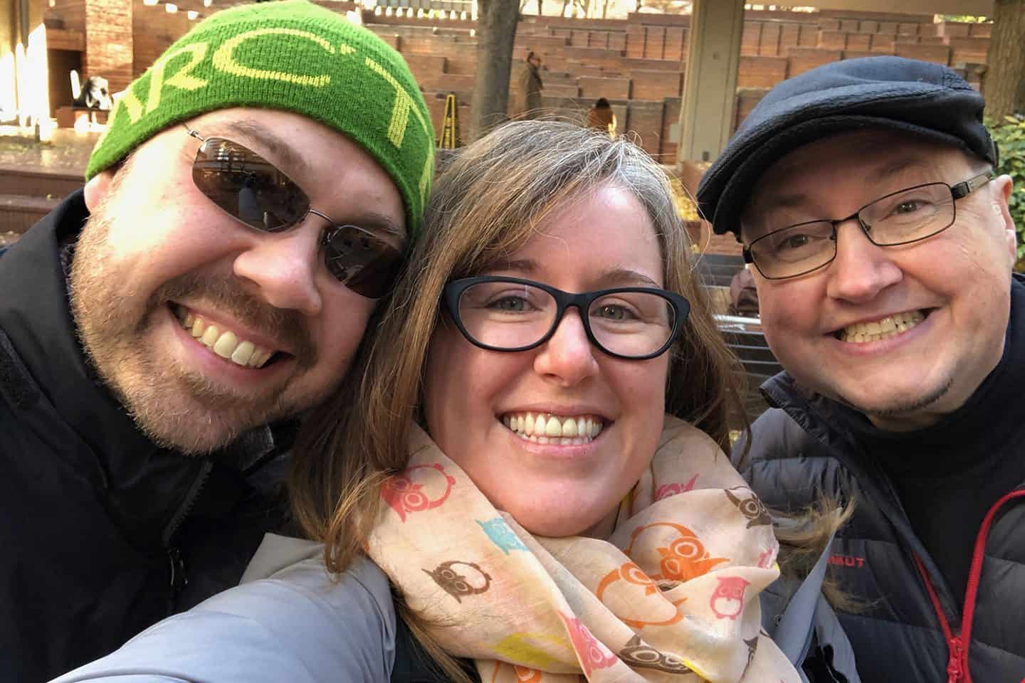 The audio quality isn’t great, as we were sitting outside in a noisy courtyard with people having lunch and rolling suitcases around etc. but I hope you’ll find that the content of our conversation more than makes up for that. Anyway, please take a listen with the audio player at the top of the post, and here’s a selfie that Nicole shot after our conversation, to add a little color to the post. 🙂