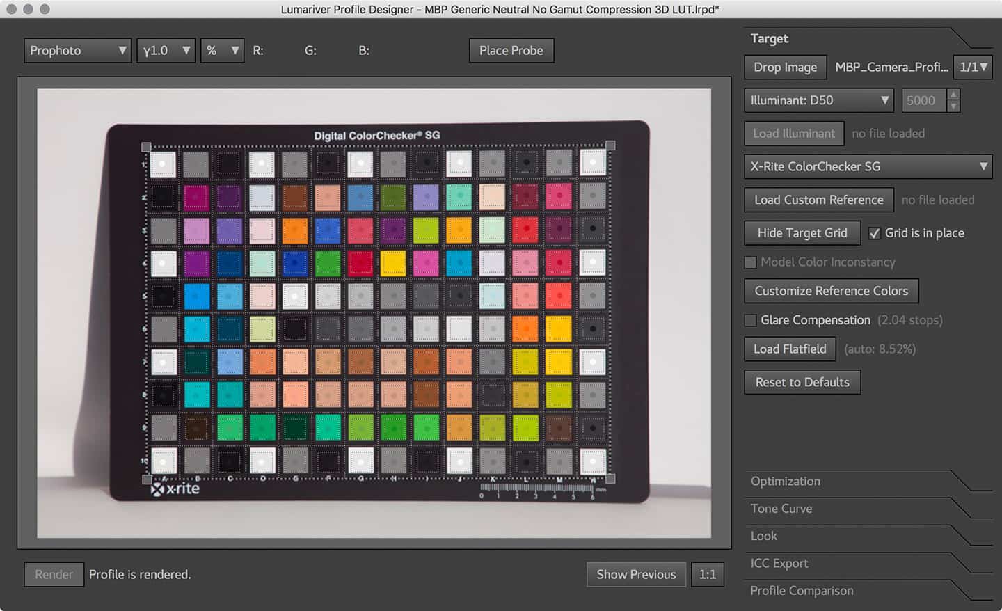 Finally, under the ICC Export section, I turned on High-Resolution LUT, because I can, and we’re now ready to press the Render button. Wow! Right there I like what I see very much. We can now export the ICC profile. The default Profile folder that was selected was for me only. So that I can access this profile from other users, should I create any, I changed this to the /Library/ColorSync/Profiles folder, and called my new profile “CanonEOS5DSR-MBP Generic”. I used this naming convention so that Capture One Pro would list my profile alongside the other CanonEOS5DSR profiles.