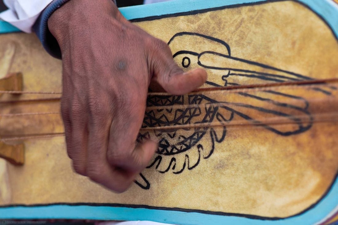 The first image that I wanted to talk about, was of the hand of a musician as he plucked away at what I believe is called a Sintir or a Guembri, but these are supposed to have only three strings, and in this photo there are two darker colored strings that seem to be beneath the three main strings. The instrument was obviously hand-made though, so maybe he just added a couple of string to build on the capabilities of a traditional Sintir.