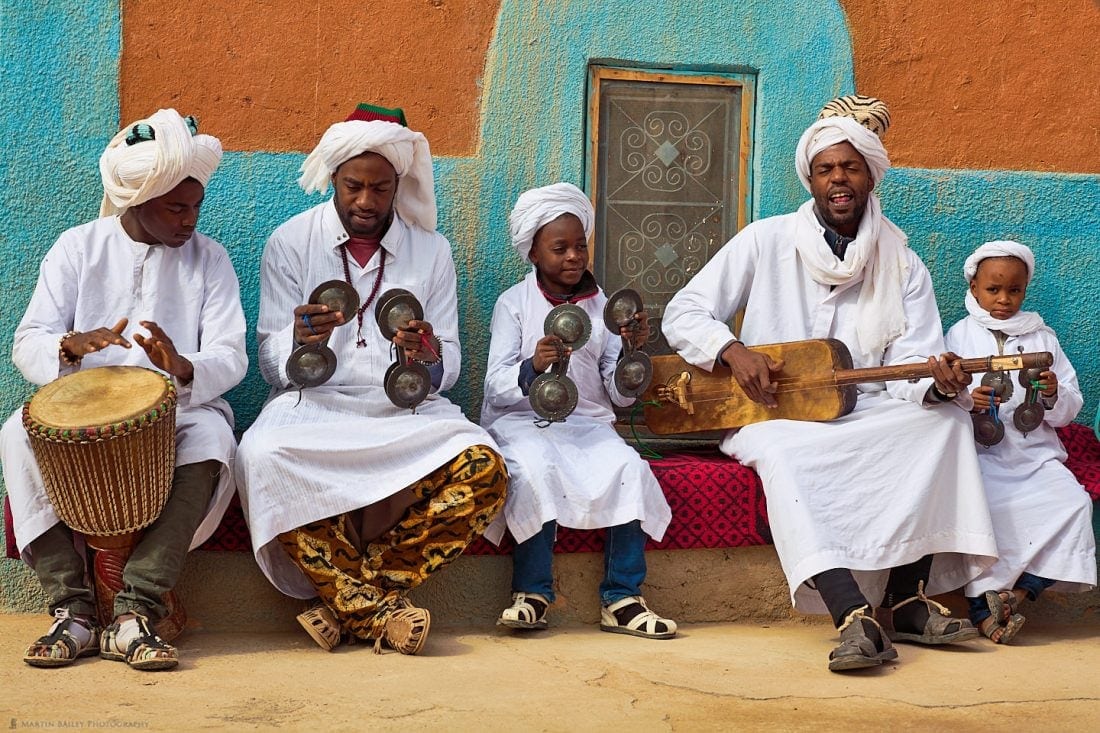 The steel castanet type instruments that you can hear and also see in this next image are called karkabou. The Sintir is also a traditional three-stringed Sintir in this shot too, so you can see what the entire instrument looks like. I thought it was nice that the kids are starting to get into what is probably a family business, and you’ll be glad to know, if you think about these things like I do, that it was a Sunday when we visited these musicians, so the kids weren’t being kept out of school to play in this band.