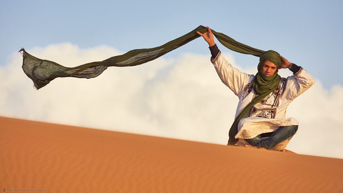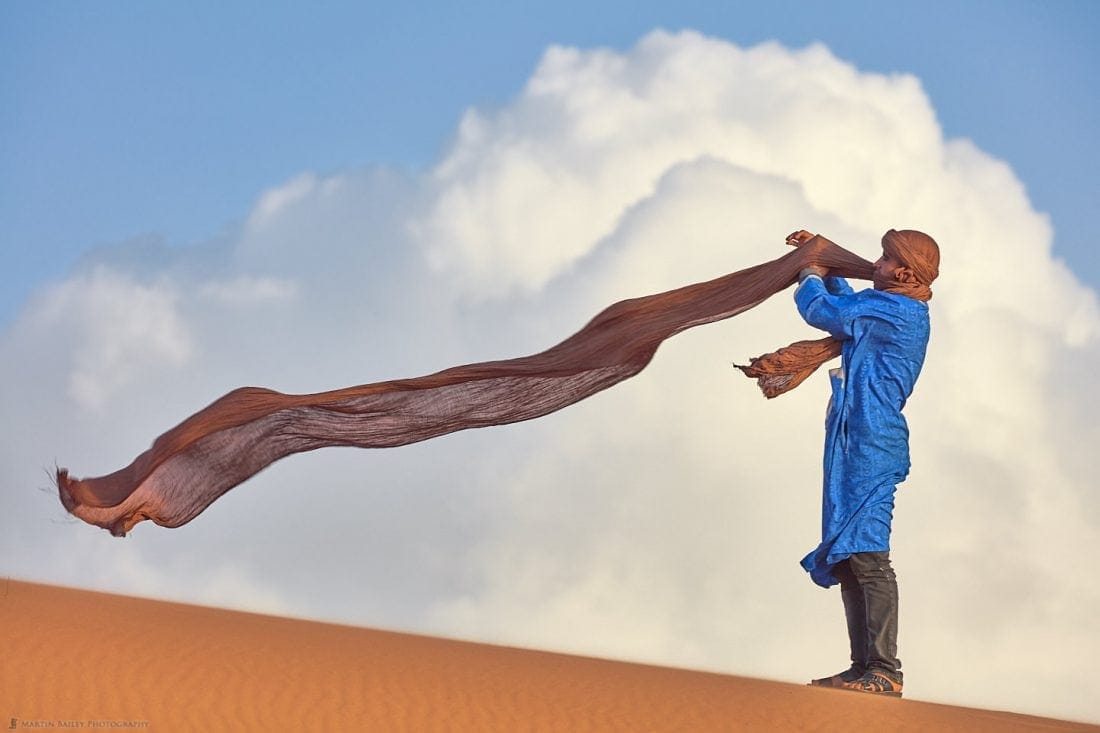 While we had the opportunity, we asked another of the camel handlers to also go to the top of the dune, and this time photographed him sitting down with his turban blowing in the wind.